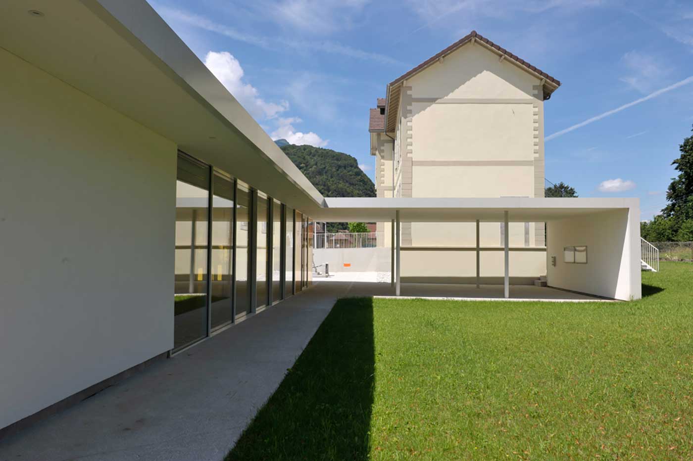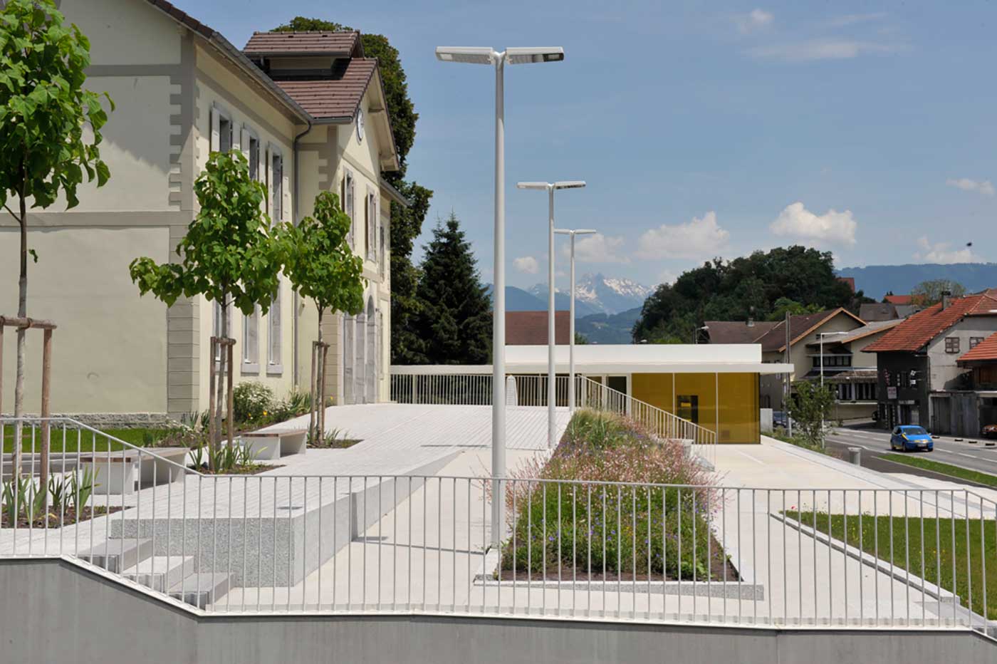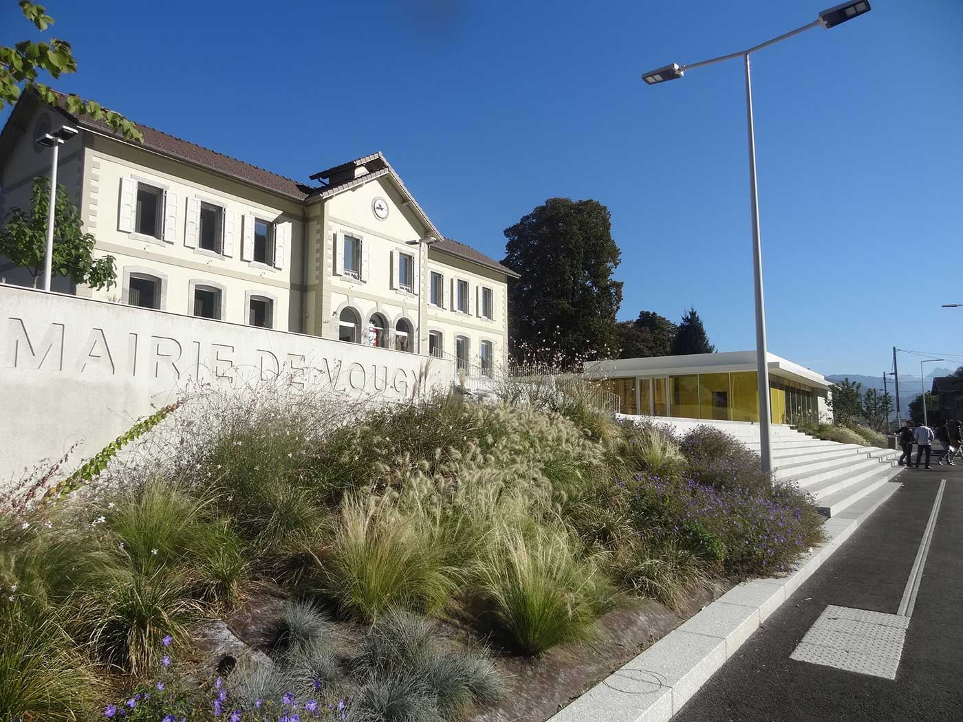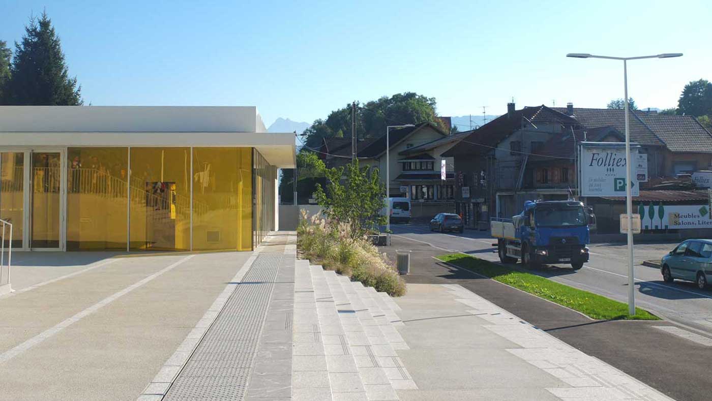 Les espaces extérieurs du projet sont composés d’une pelouse arborée à l’arrière de la mairie, espace de repos et de calme garantissant l’intégration du projet dans les champs et jardins au nord du site et d’une succession de plateaux du seuil de la mairie à la route du Mont-Blanc, formant un parvis de mairie avec sa terrasse plantée, une place publique à mi-pente en relation avec la salle communale et son préau, un large trottoir accueillant l’arrêt bus. Cette gradation d’espaces dans la pente permet de hiérarchiser les usages sur le site et de dissocier l’espace public des espaces circulés par les voitures, et offrir aux usagers une terrasse plantée de paulownias proposant des vues dégagées sur les montagnes et ainsi une relation avec le grand paysage.