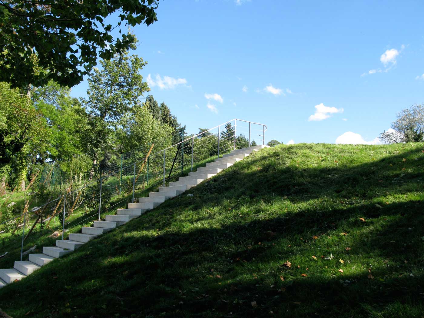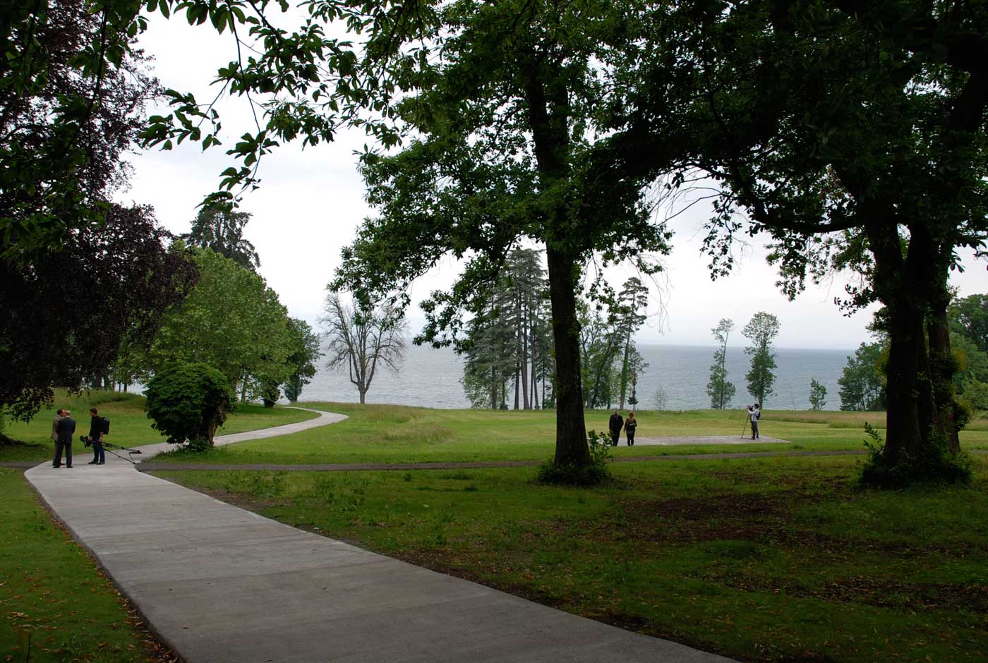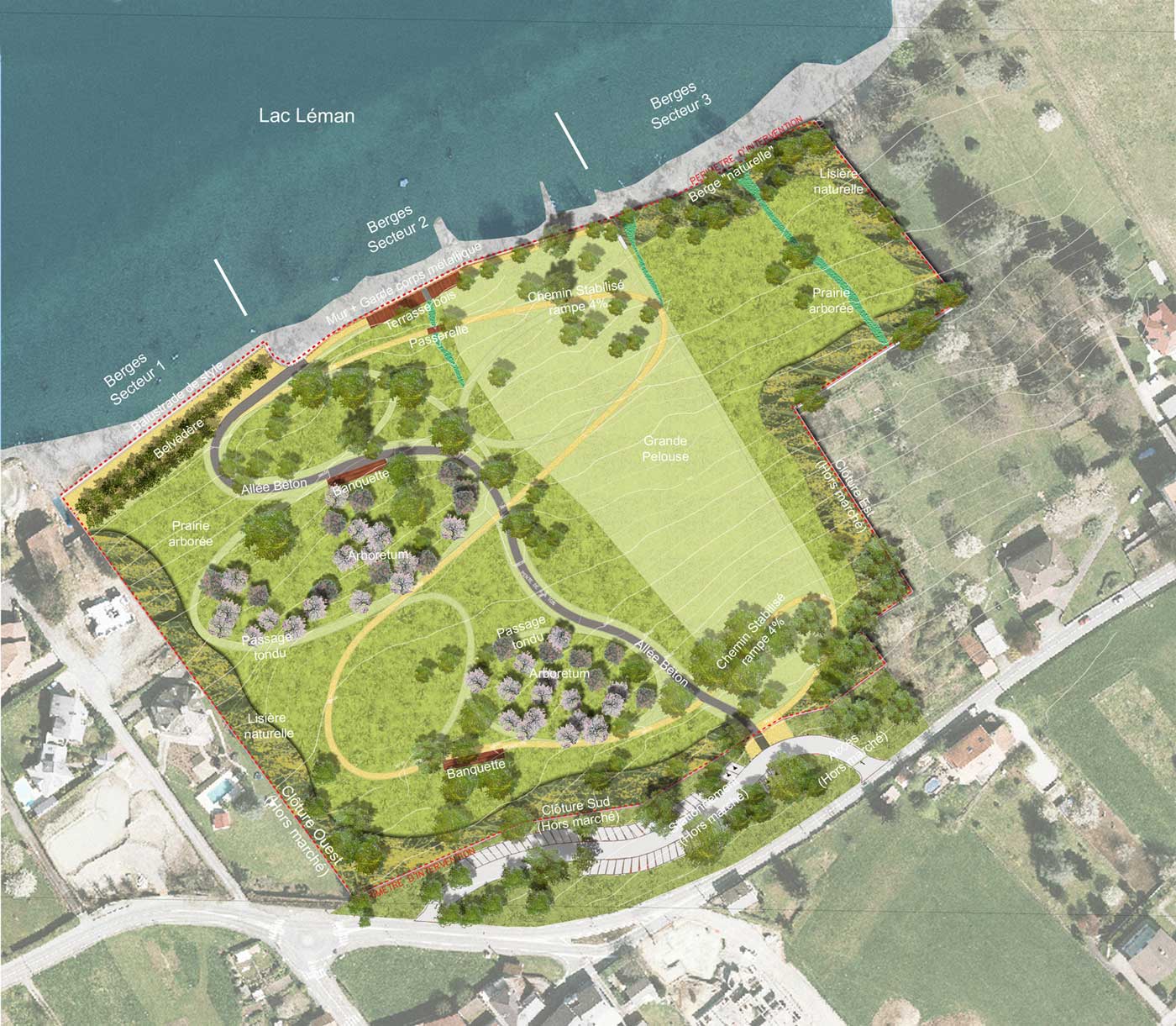 A partir d’un parc de stationnement créé sous les frondaisons de la frange boisée au Sud du parc, implanté aléatoirement de façon à conserver le patrimoine arboré existant, nous avons installé des parcours de promenade dans la pente qui mènent aux berges du Lac Léman. Différentes séquences sont mises en place dans cette pente, elles orientent le regard du visiteur : un large tapis vert ouvre une grande perspective sur le lac dès l’entrée dans le parc ; une prairie de fauche offre l’ambiance champêtre et des passages tondus dessinant des ellipses redéfinissent des espaces contrastés de clairières et de bosquets.