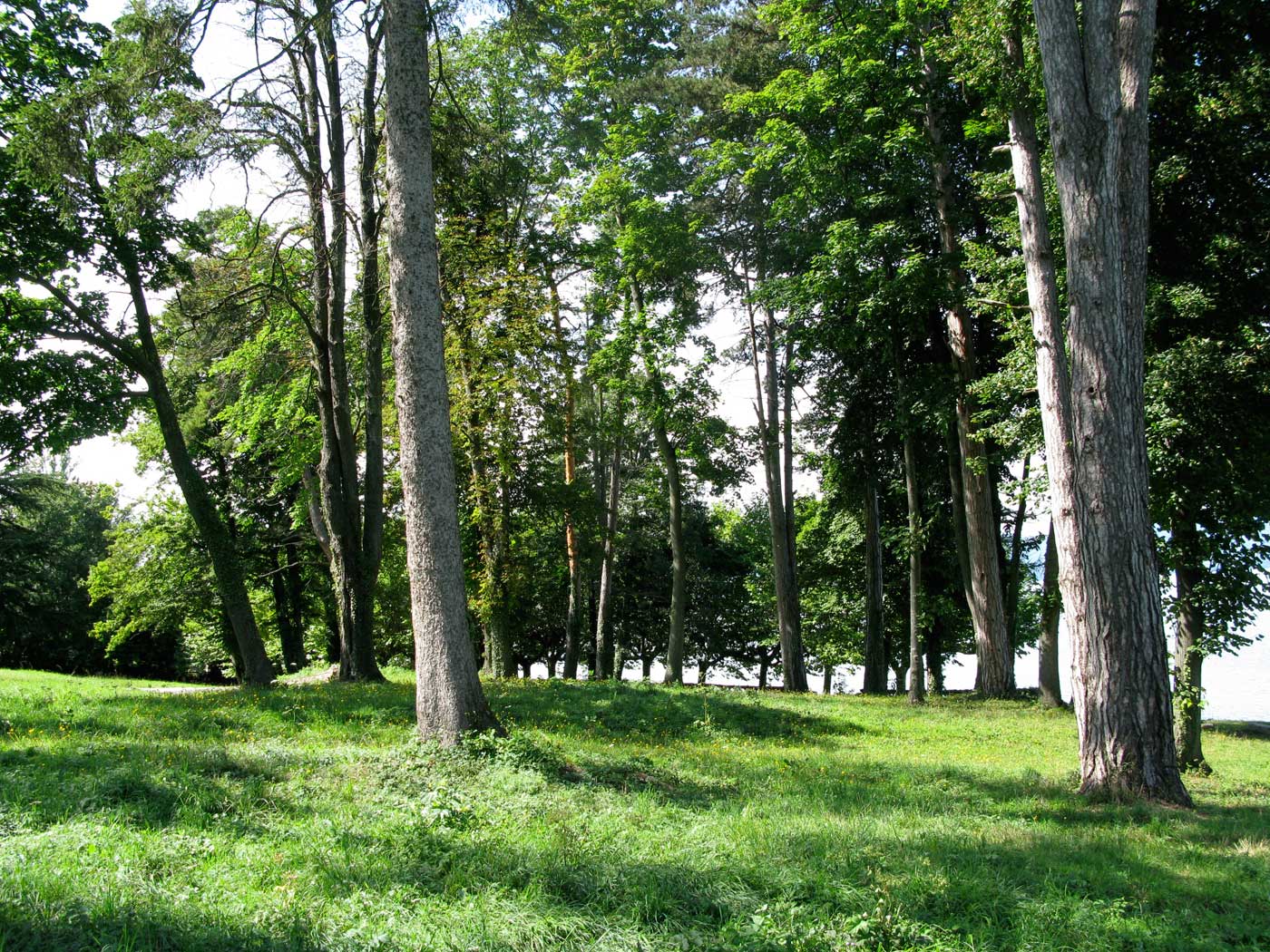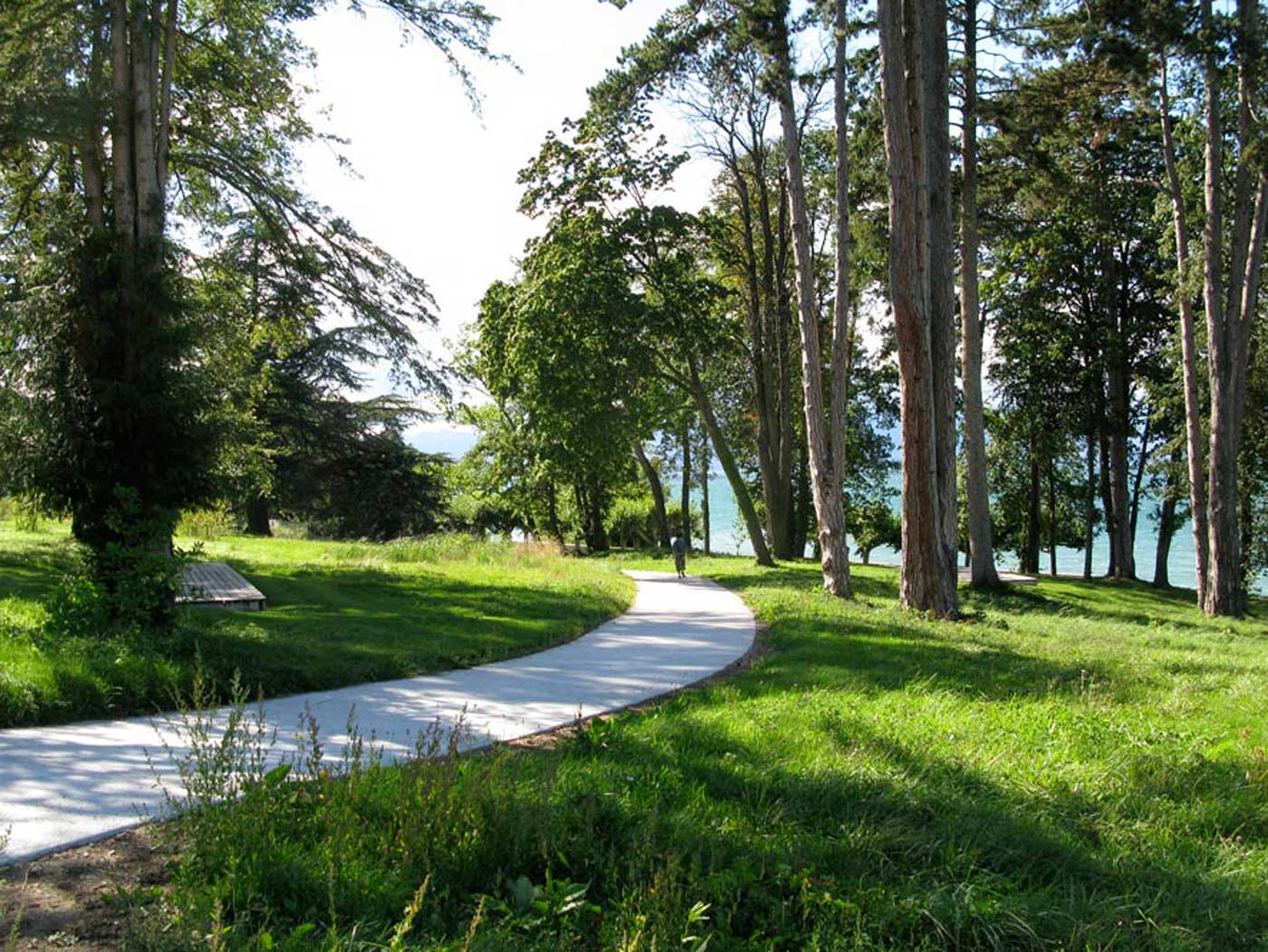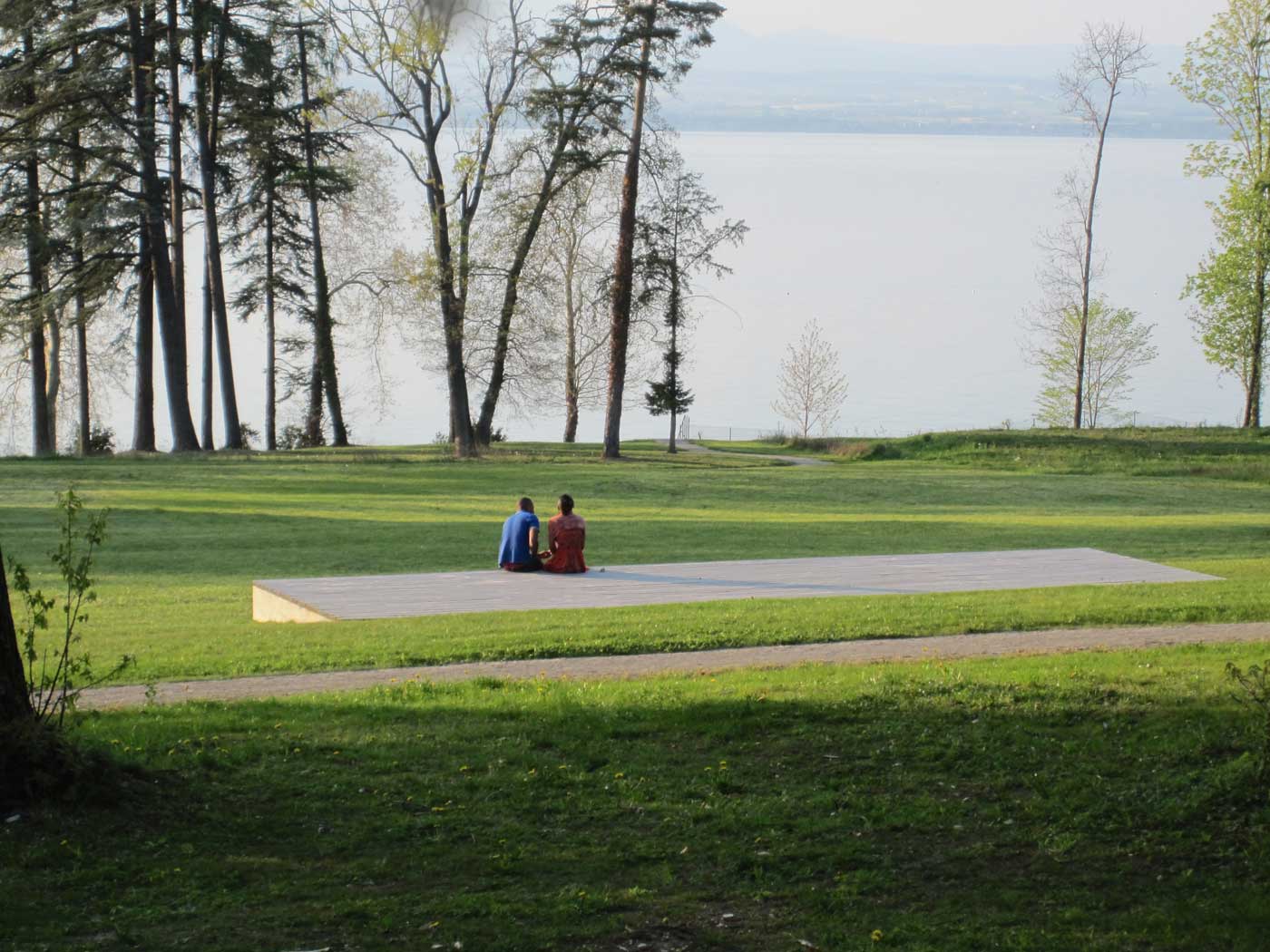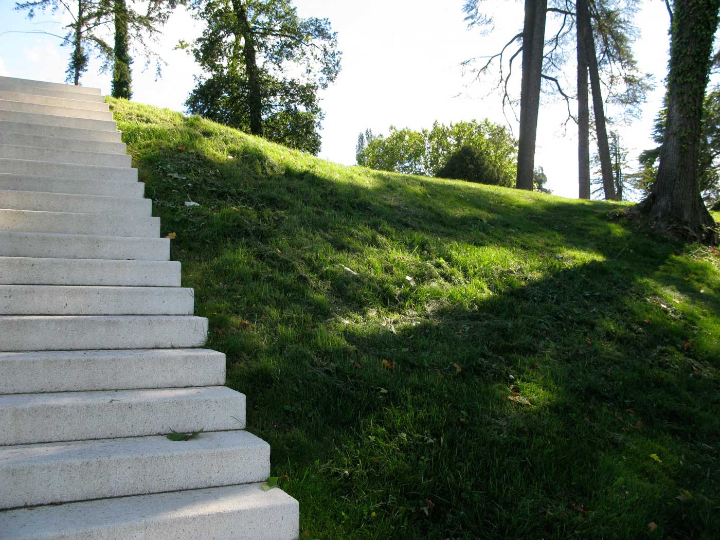 A partir d’un parc de stationnement créé sous les frondaisons de la frange boisée au Sud du parc, implanté aléatoirement de façon à conserver le patrimoine arboré existant, nous avons installé des parcours de promenade dans la pente qui mènent aux berges du Lac Léman. Différentes séquences sont mises en place dans cette pente, elles orientent le regard du visiteur : un large tapis vert ouvre une grande perspective sur le lac dès l’entrée dans le parc ; une prairie de fauche offre l’ambiance champêtre et des passages tondus dessinant des ellipses redéfinissent des espaces contrastés de clairières et de bosquets.