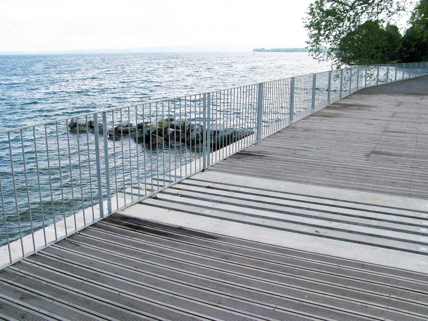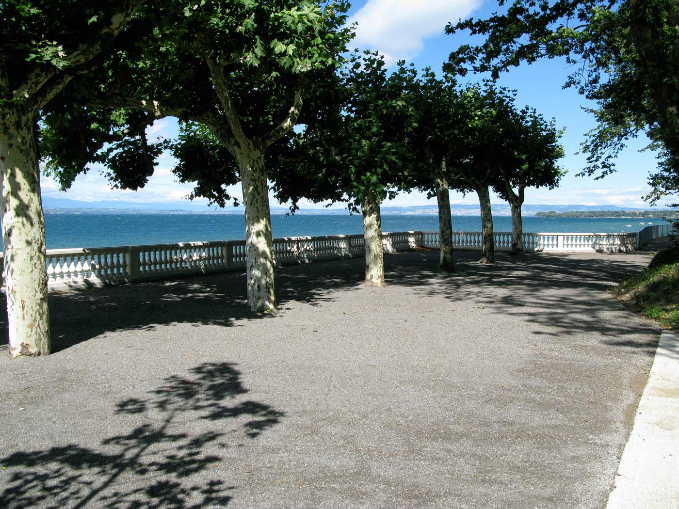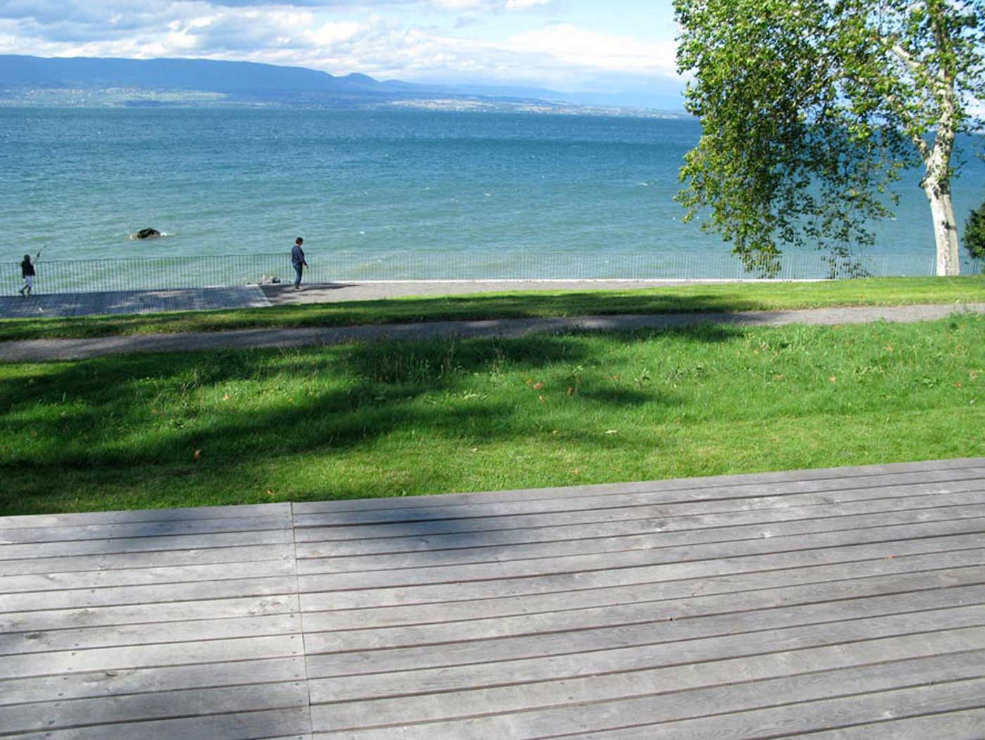 Les ouvrages réalisés invitent par leur présence discrète à une appropriation des lieux ainsi qu’à une sensibilisation aux richesses du milieu naturel en place : des banquettes bois incitent à s’arrêter un moment pour contempler le lac ou prendre un bain de soleil, une passerelle et un gué mettent en scène la résurgence d’une source, une terrasse bois offre une scène ouverte sur l’étendue du Léman et un mail planté de platanes forme un balcon classique face au lac.
