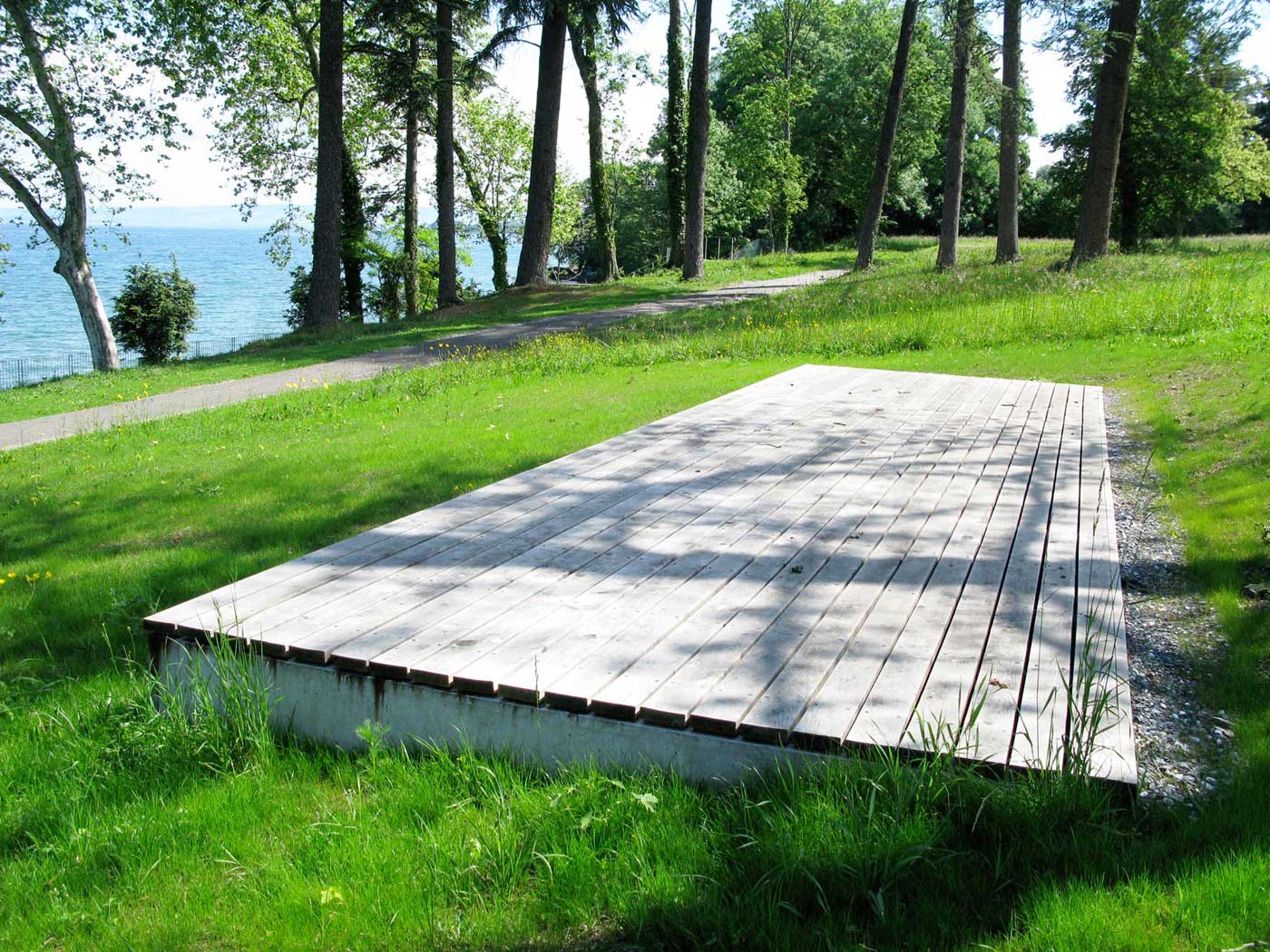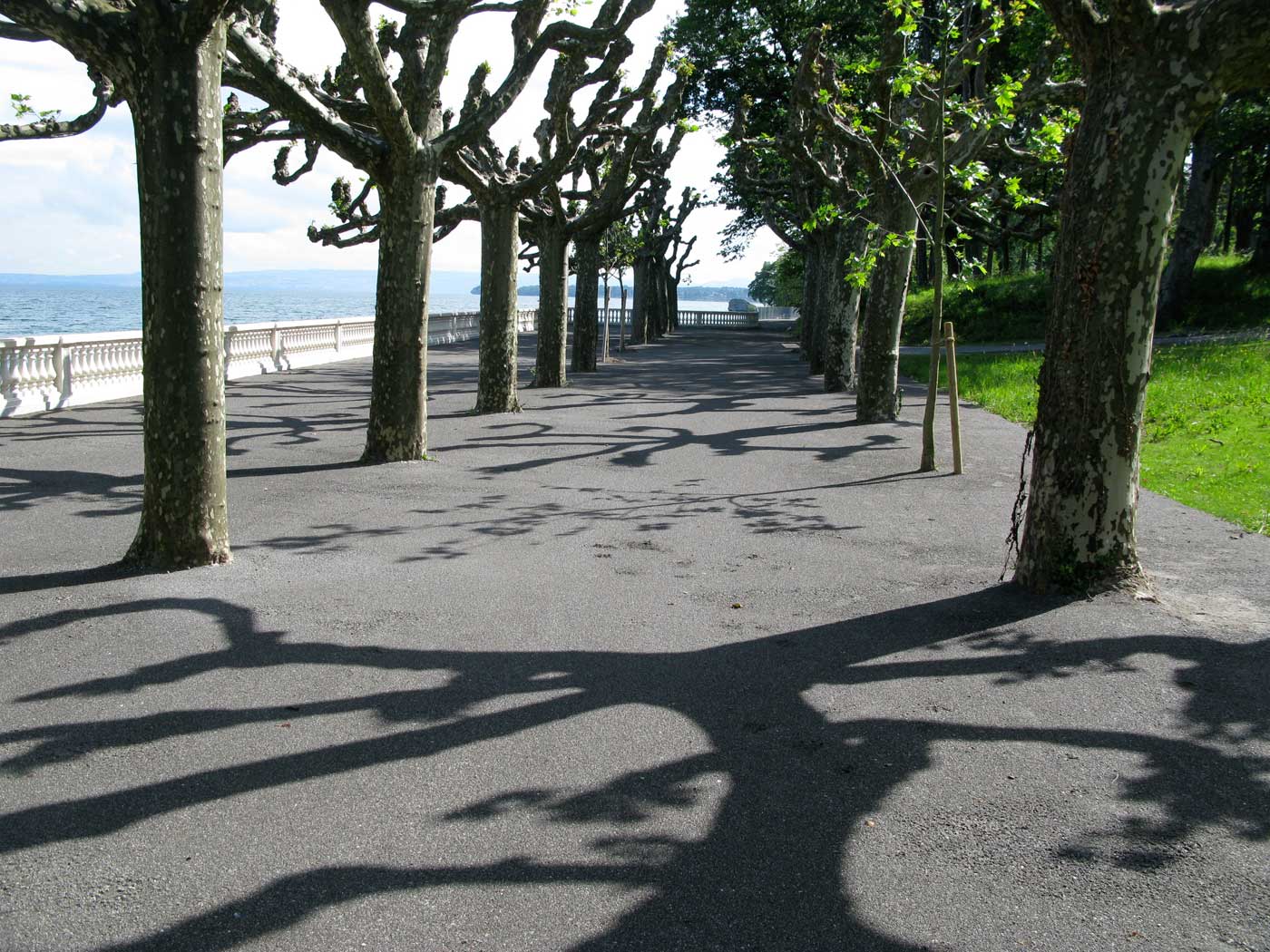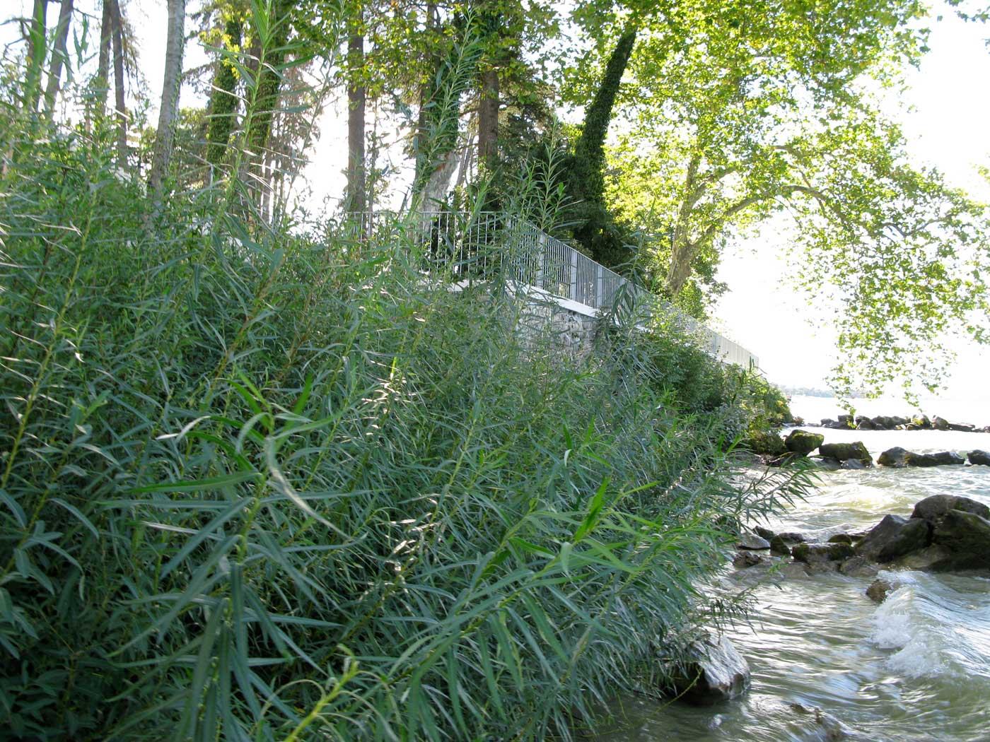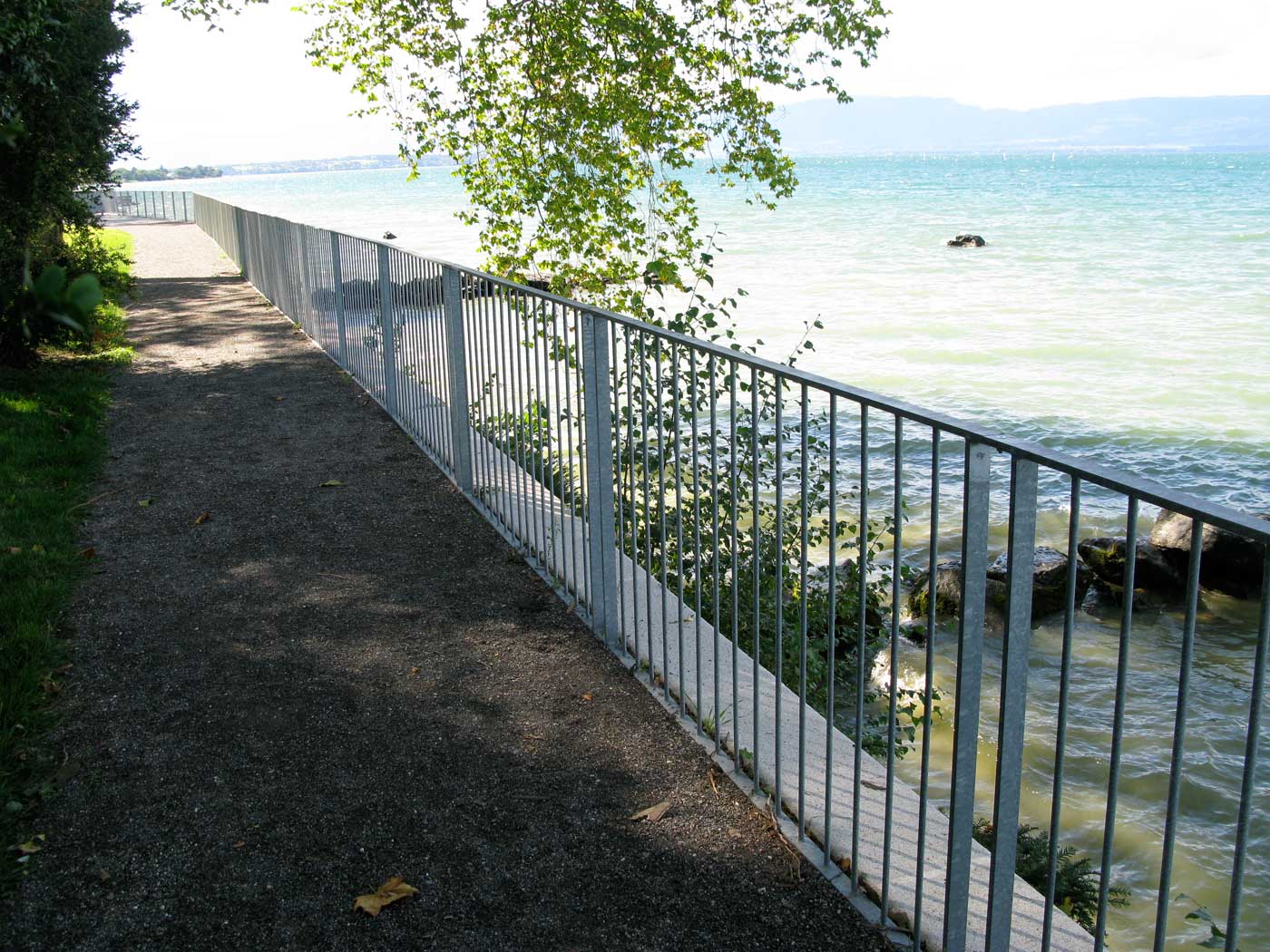 Les ouvrages réalisés invitent par leur présence discrète à une appropriation des lieux ainsi qu’à une sensibilisation aux richesses du milieu naturel en place : des banquettes bois incitent à s’arrêter un moment pour contempler le lac ou prendre un bain de soleil, une passerelle et un gué mettent en scène la résurgence d’une source, une terrasse bois offre une scène ouverte sur l’étendue du Léman et un mail planté de platanes forme un balcon classique face au lac.