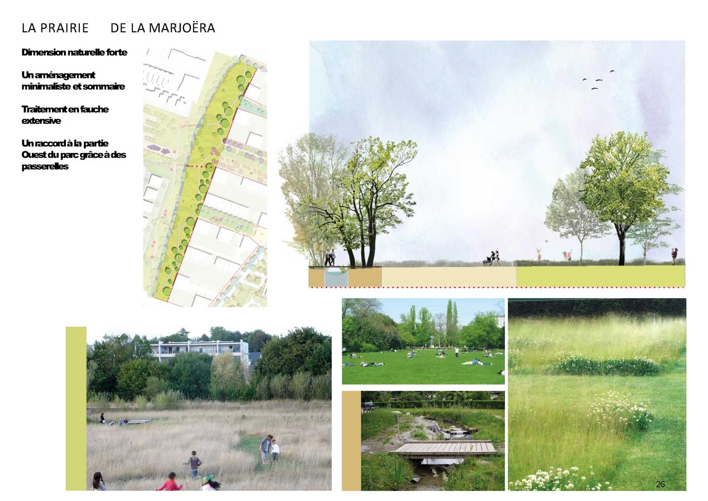 Le scénario final proposé respecte une organisation spatiale en bandes Est-Ouest permettant de conserver de larges percées visuelles sur le Vercors. Le quartier est structuré par un axe multimodal Nord-Sud. Sur la partie Ouest, le parc de la Marjoëra est un espace destiné à une gestion différenciée qui permet la préservation de la biodiversité.