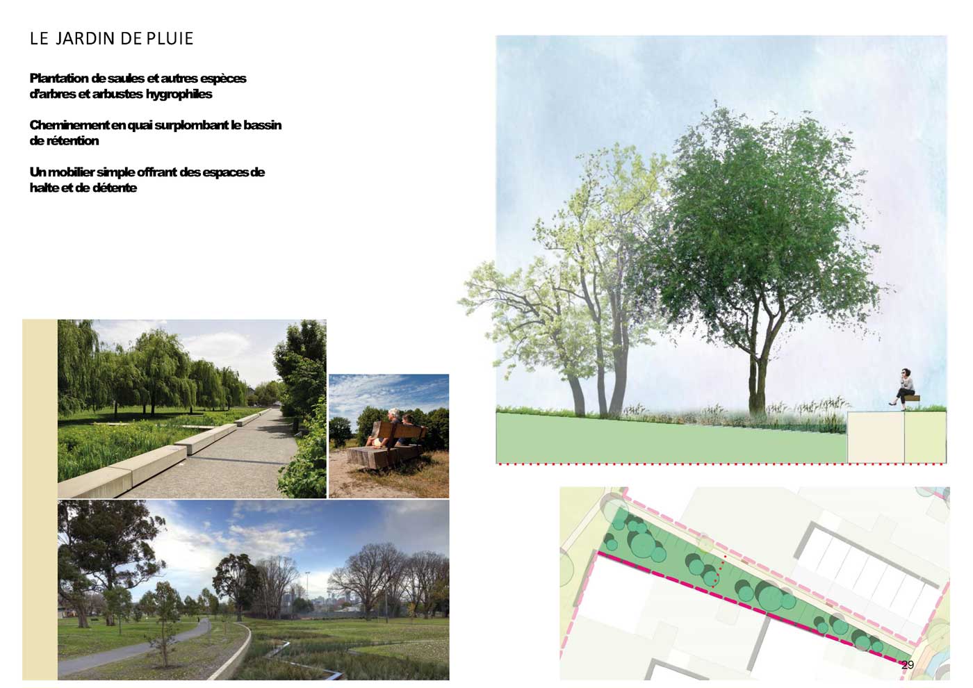 Les espaces libres entre chaque îlots bâtis présentent des caractéristiques complémentaires et distinctes, adaptées à leurs situations respectives : espace de préservation de vergers, implantation d’un nouveau verger et de jardins partagés, jardin de pluie, mail piéton central agrémenté de structure de jeux et de terrains de pétanque et city stade.