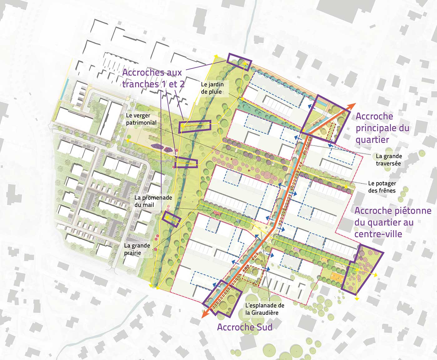 Le site de la Giraudière a une situation stratégique au sein de la métropole grenobloise. Les enjeux y sont multiples : articuler le quartier avec le tissu urbain dans lequel il s’insère, préserver les vues sur le grand paysage, conserver l’identité du lieu à travers le vocabulaire végétal patrimonial des vergers et du monde agricole, mettre en valeur la rivière en en faisant un espace fédérateur, installer une gradation d’usages permettant de respecter les contraintes environnementales du site, définir un programme complémentaire aux projets menés sur la partie Ouest, hiérarchiser les déplacements au sein du quartier, conforter la place des modes doux, proposer des modes de gestion durables en terme d’eaux pluviales et d’espaces verts.