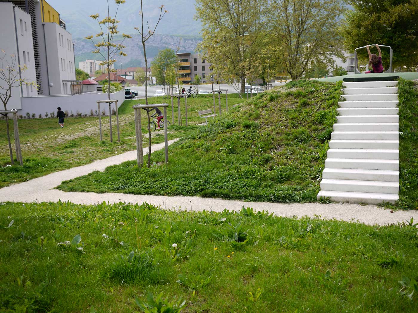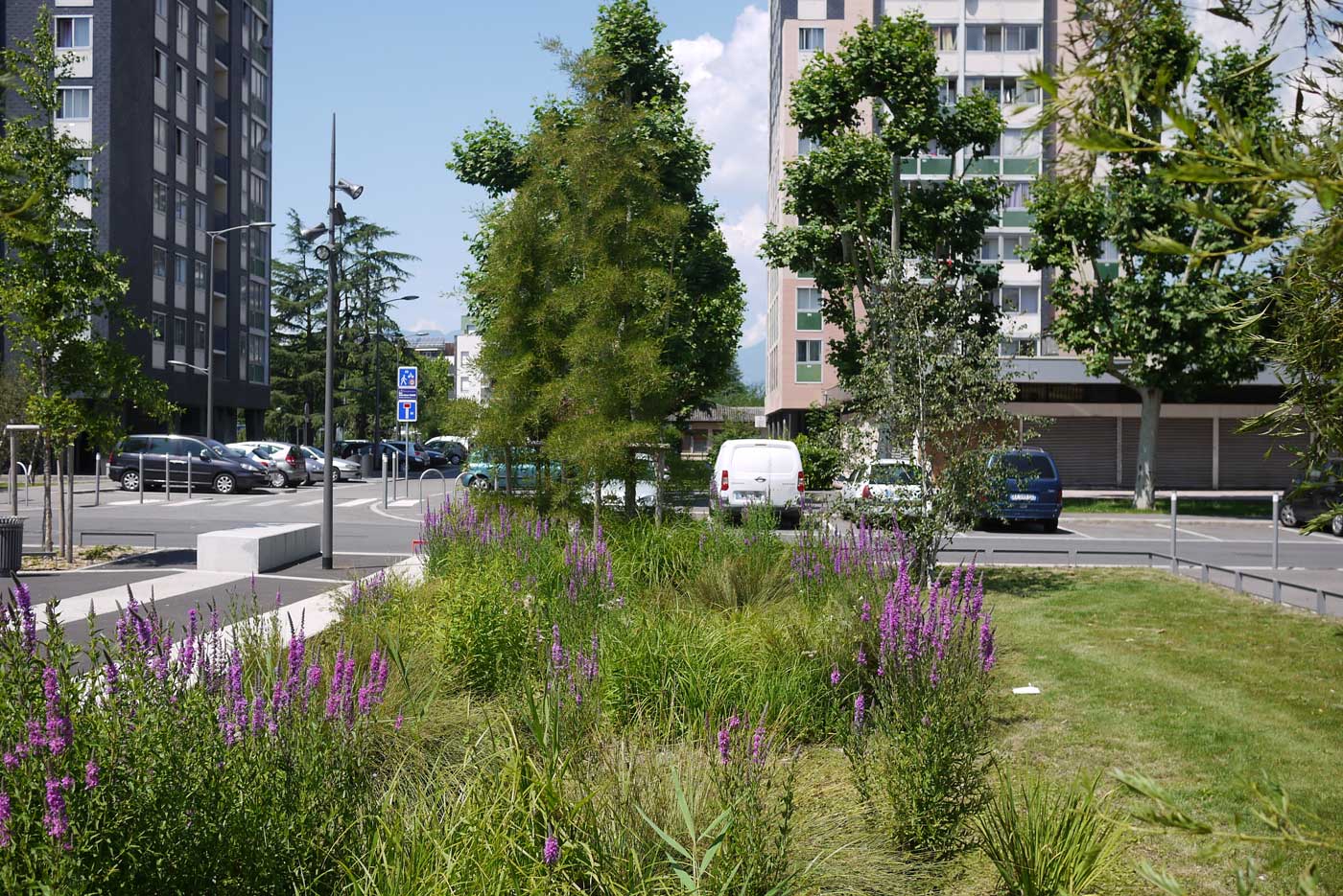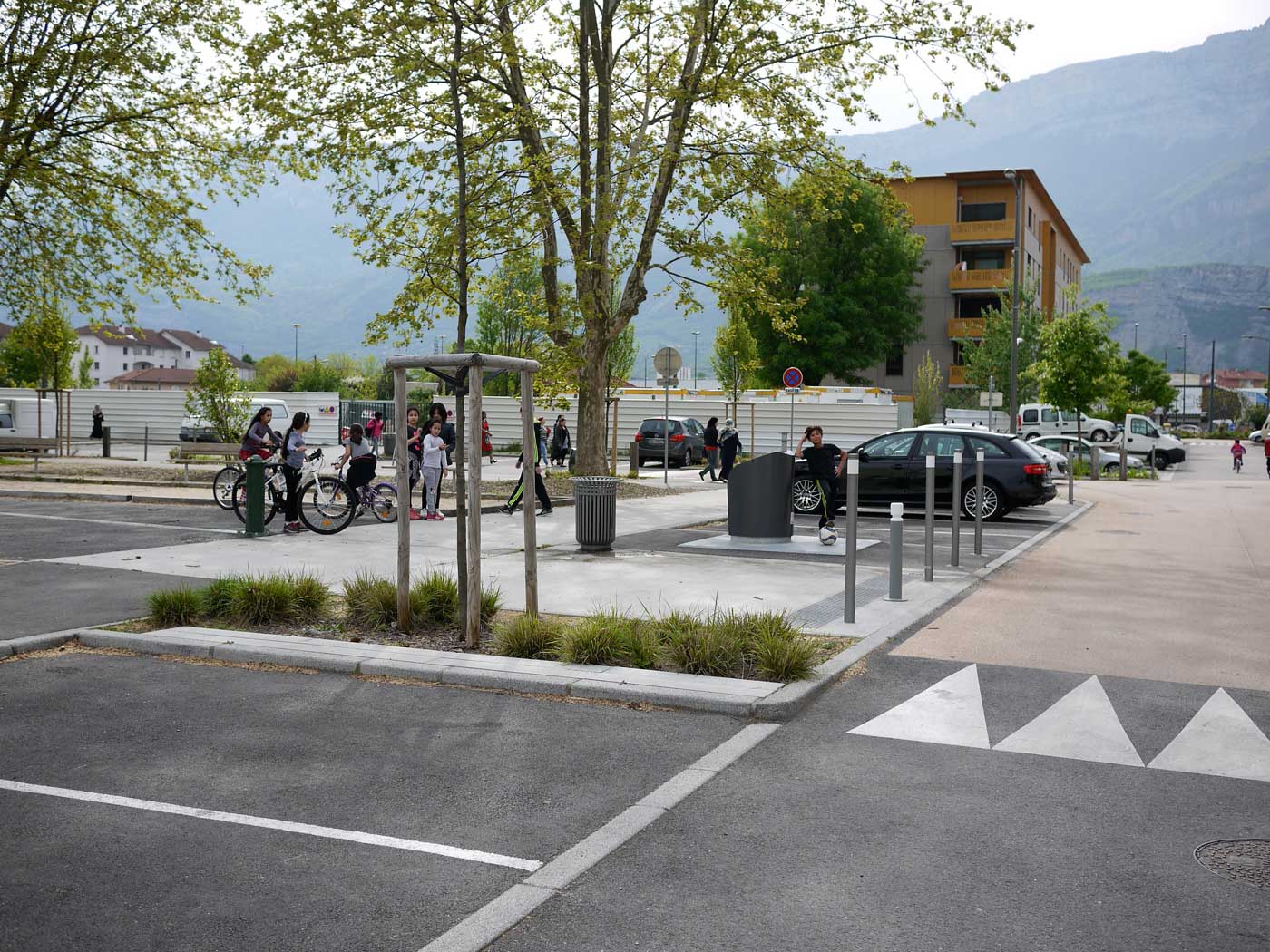 Chaque espace est accompagné d’une démarche de gestion des eaux pluviales, un parcours de l’eau amène les eaux de ruissellement jusque dans les zones d’infiltration. Sur la place centrale des fontaines à boire viennent animer l’espace, grâce à un travail de gestion des pentes les eaux ruissellent jusque dans les noues présentes à cet effet pour finir leur course dans la zone d’infiltration.