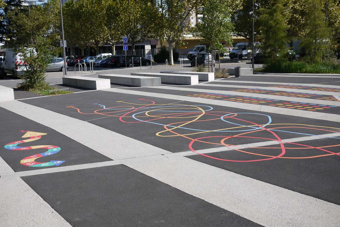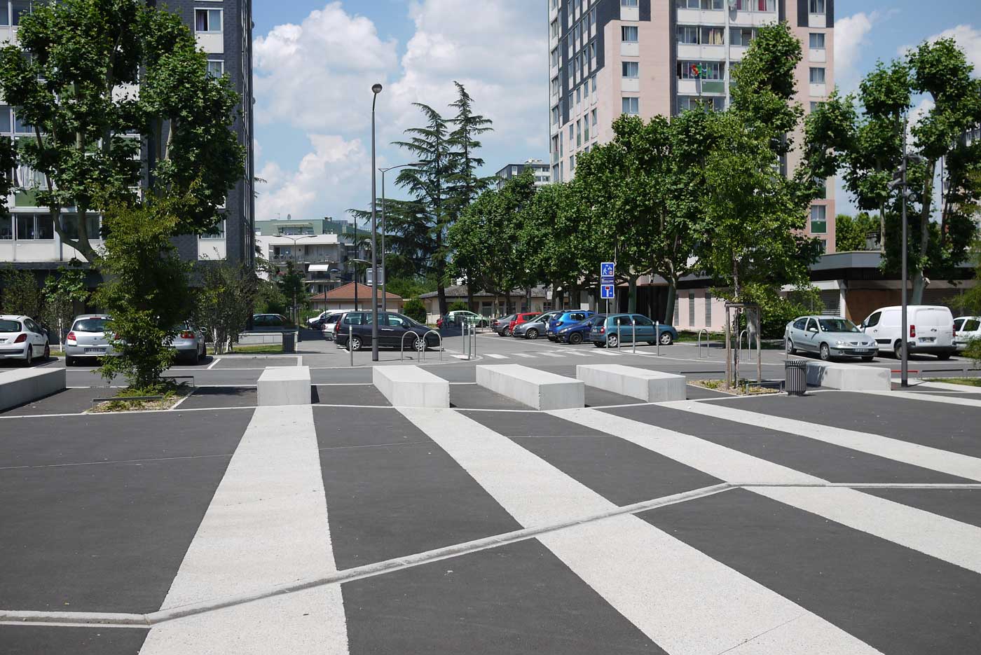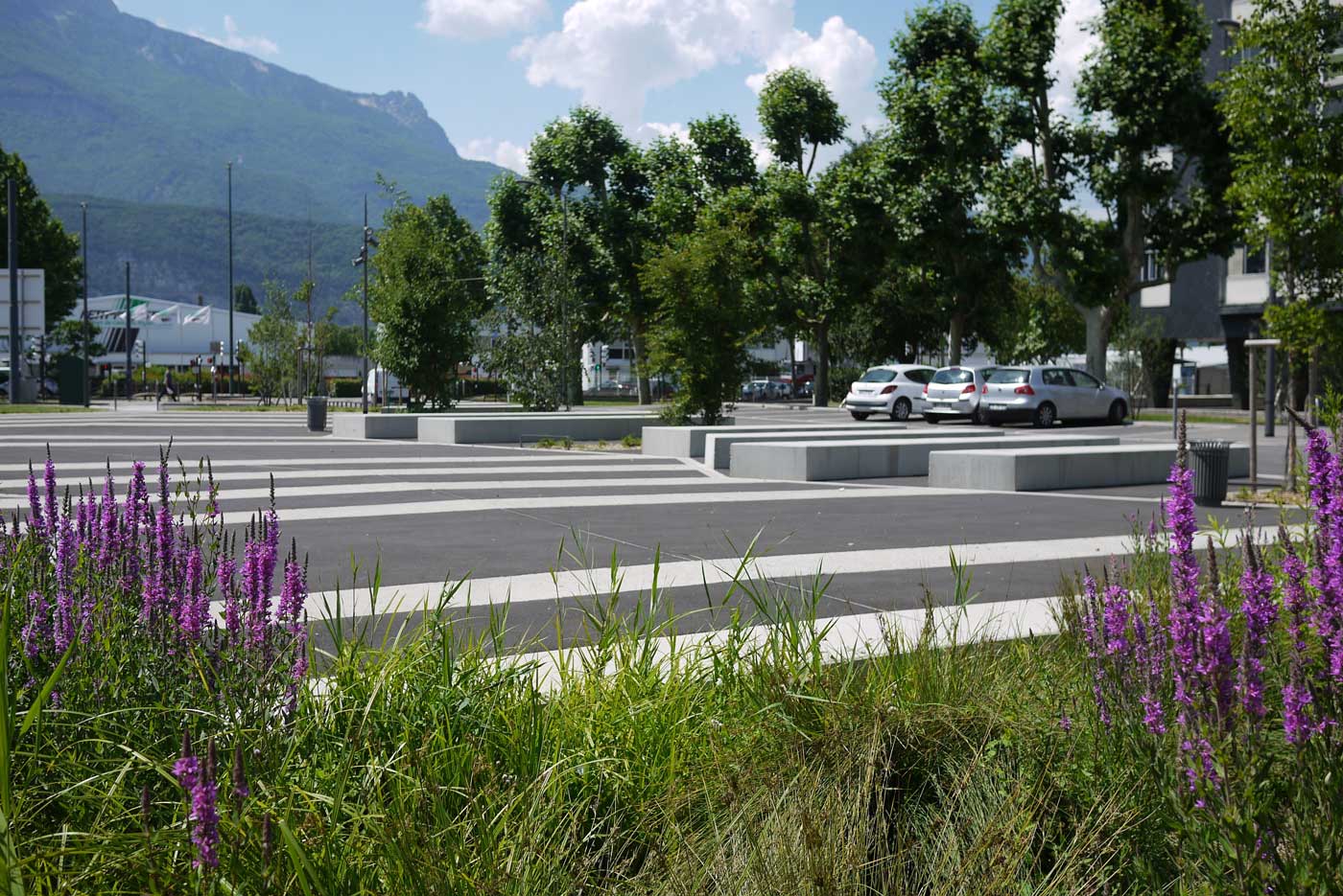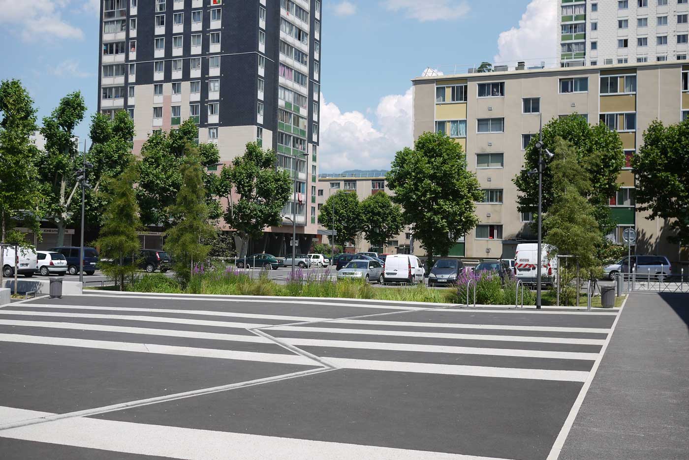 Chaque espace est accompagné d’une démarche de gestion des eaux pluviales, un parcours de l’eau amène les eaux de ruissellement jusque dans les zones d’infiltration. Sur la place centrale des fontaines à boire viennent animer l’espace, grâce à un travail de gestion des pentes les eaux ruissellent jusque dans les noues présentes à cet effet pour finir leur course dans la zone d’infiltration.